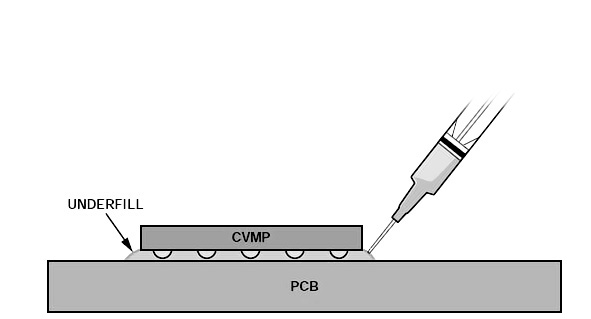底部填充膠的應(yīng)用原理是利用毛細(xì)作用使得膠水迅速流過BGA芯片底部芯片底部,其毛細(xì)流動的最小空間是10um。這也符合了焊接工藝中焊盤和焊錫球之間的最低電氣特性要求,因為膠水是不會流過低于4um的間隙,所以保障了焊接工藝的電氣安全特性。