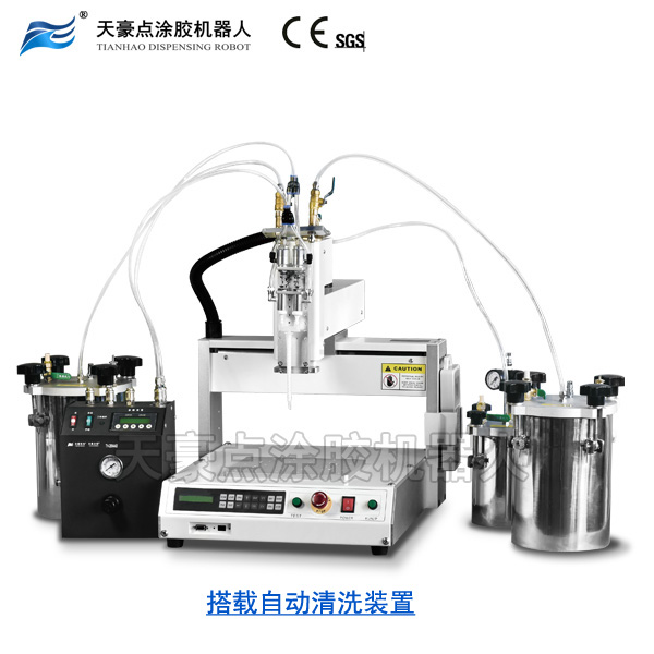 機(jī)器搭載膠閥式雙液定量控膠系統(tǒng)以及懸浮型機(jī)械手結(jié)構(gòu)(可選擇搭載自動(dòng)清洗裝置),一般適用于可調(diào)比例(粘度低于10000CPS,重量比1:1-1:3的桶裝雙液膠、AB膠)的產(chǎn)品自動(dòng)點(diǎn)涂膠作業(yè),如電容、繼電器等,其代替人工在各種平面或曲面的產(chǎn)品上進(jìn)行高精度定量的雙液快速打點(diǎn)、畫線、畫圓等自動(dòng)點(diǎn)涂膠作業(yè)。另外,天豪自創(chuàng)的控制技術(shù)通過(guò)調(diào)節(jié)AB膠閥行程實(shí)現(xiàn)配比,從而完全避免了通過(guò)調(diào)節(jié)壓力配比方式造成的配比精度不高、膠水倒灌等問(wèn)題,從而實(shí)現(xiàn)了將兩種膠水自動(dòng)配比、自動(dòng)混合和配合機(jī)械手進(jìn)行自動(dòng)點(diǎn)涂膠作業(yè)的全過(guò)程。