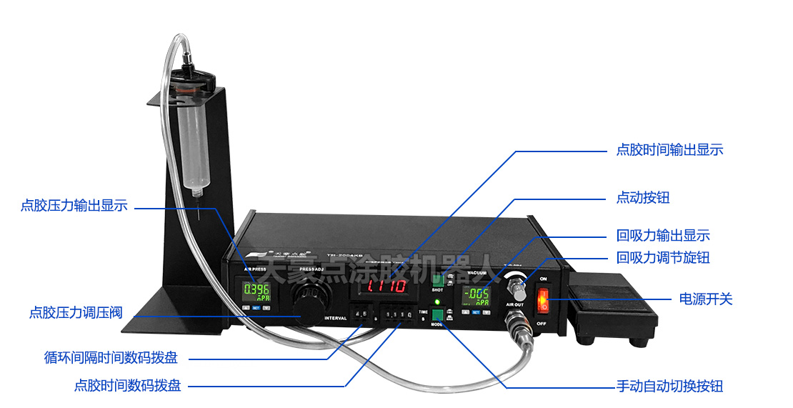 適用于小膠量的產(chǎn)品精密點膠工藝需求,并采用腳踏開關(guān)控制,可搭載天豪三軸點涂膠機器人使用。 | |