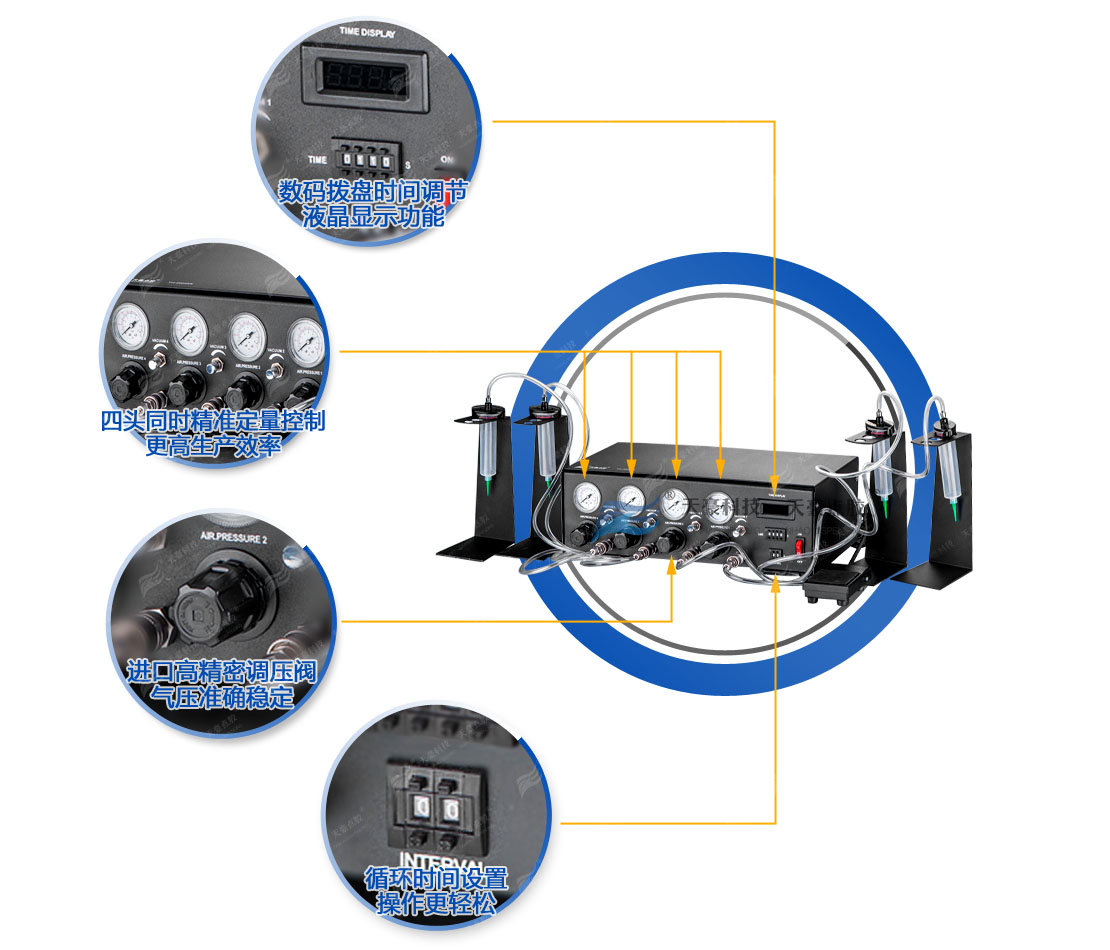 機器配備四頭定量同時出膠裝置,以及增設(shè)LCD顯示和數(shù)碼循環(huán)功能,使點膠效率成倍提升,點膠時間更加直觀,操作更加方便,并配備進口MAC電磁閥和諾冠高精密調(diào)壓閥。