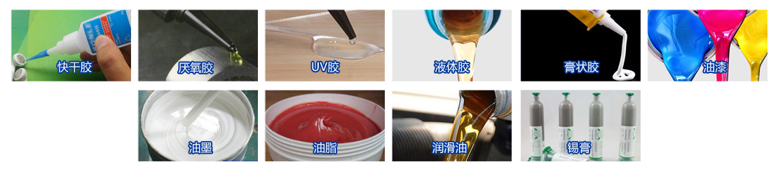 常用膠水特性:快干膠、厭氧膠、UV膠、液體膠、膏狀膠、油漆、油墨、油脂、潤(rùn)滑油、錫膏等。 | |||