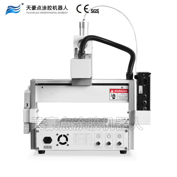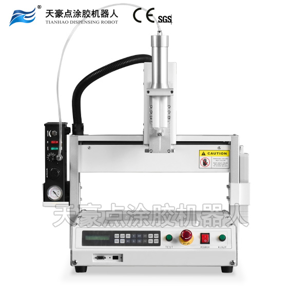 機器搭載50ml針筒式雙組份膠專用精密膠量控膠系統(tǒng)以及懸浮型機械手結(jié)構(gòu),一般適用于固定體積比例1:1,2:1,4:1,10:1的50ml針筒式包裝的AB雙液膠的產(chǎn)品點涂膠,其可代替人工在各種平面或曲面的產(chǎn)品上進行高精度微量的雙液快速打點、畫線、畫圓等自動點涂膠作業(yè)。